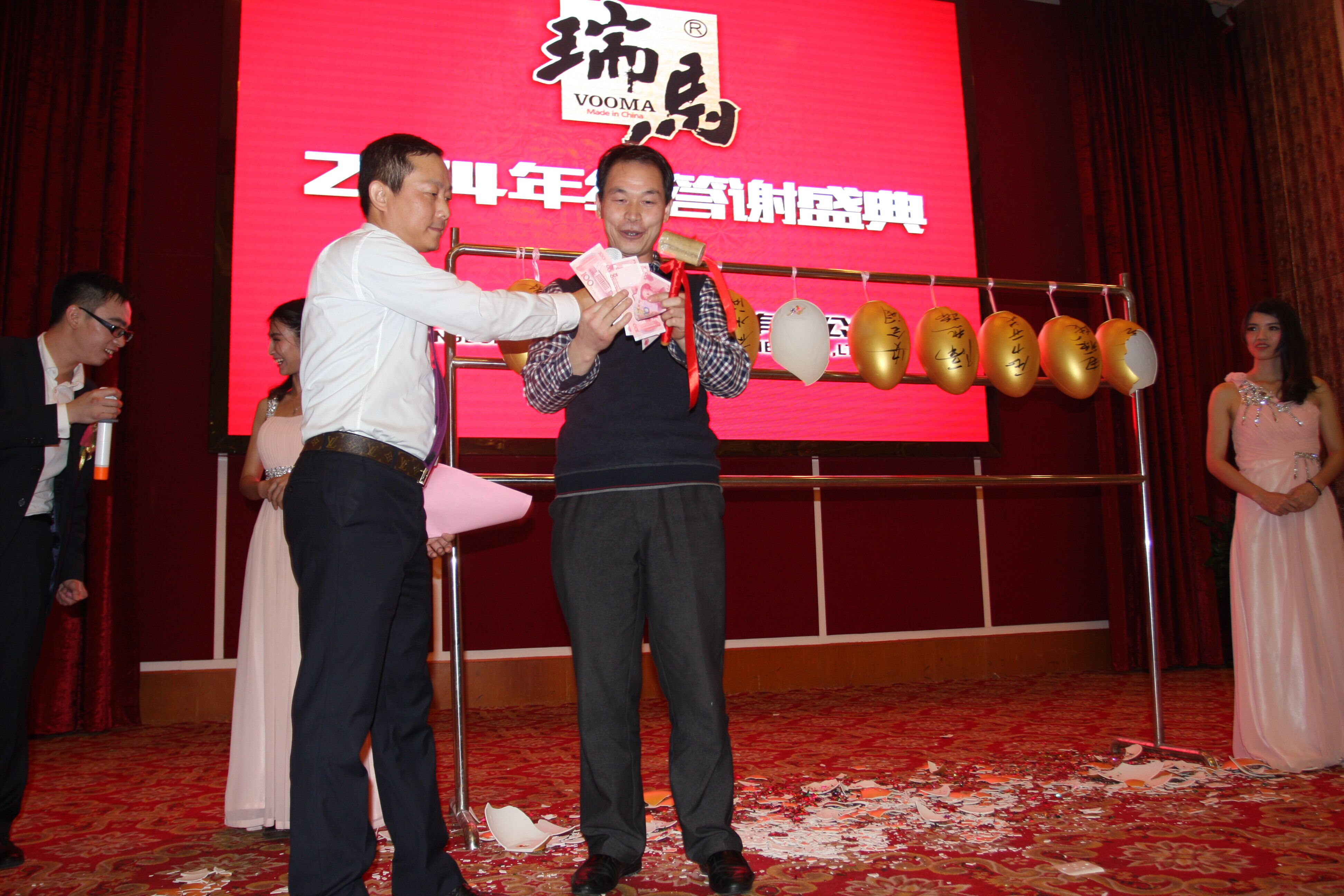 一輪熱舞過后,當(dāng)然是簡單而又隆重的頒獎禮。首先是頒出“2014年度優(yōu)秀經(jīng)銷商”,由馬瑞董事長頒發(fā)給新疆省庫爾勒經(jīng)銷商劉海波先生,感謝他為瑞馬壁掛爐終端市場所作的杰出貢獻!接著就是“2014年度最優(yōu)秀員工獎”,頒發(fā)給我們最可愛的馮興石員工。其實我們私下都喜歡稱他為“馮導(dǎo)”,特別地逗趣!也必須感謝他長年累月地出差在外,為我們維護經(jīng)銷商,配合經(jīng)銷商客戶的銷售工作!看到頒獎獎品居然還有iphone6,我的眼睛都發(fā)亮了!瑞馬公司真的太任性,太土豪了!