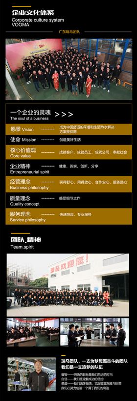 廣東瑞馬以“致力于成為中國舒適的采暖和生活熱水解決方案提供商”為企業(yè)愿景,秉承“健康、務(wù)實、創(chuàng)新、分享”的企業(yè)精神,堅持“成就客戶、成就員工、成就公司、奉獻(xiàn)社會”的核心價值觀,以“買得舒心、用得放心、合作安心、服務(wù)貼心”的經(jīng)營理念,為客戶創(chuàng)造美好生活!